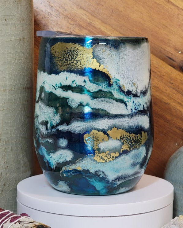 12 oz Green Swirl stemless wine cup with lid.
