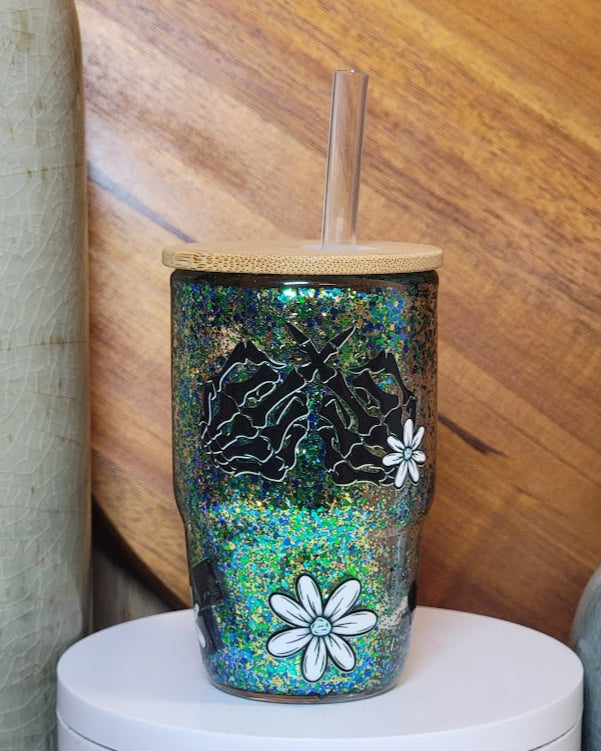 4 oz Skeleton Fingers snow globe shot glass with lid and straw.